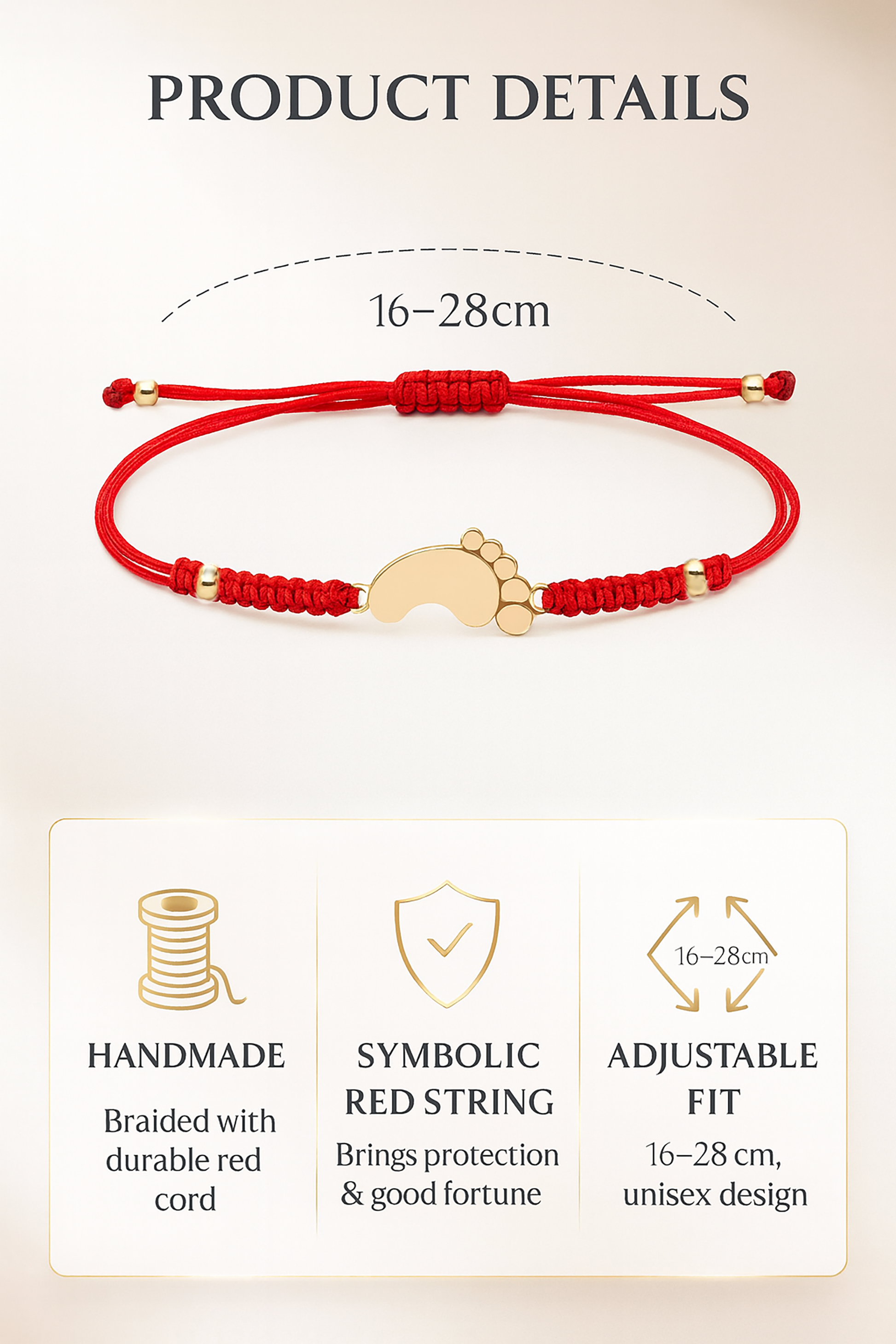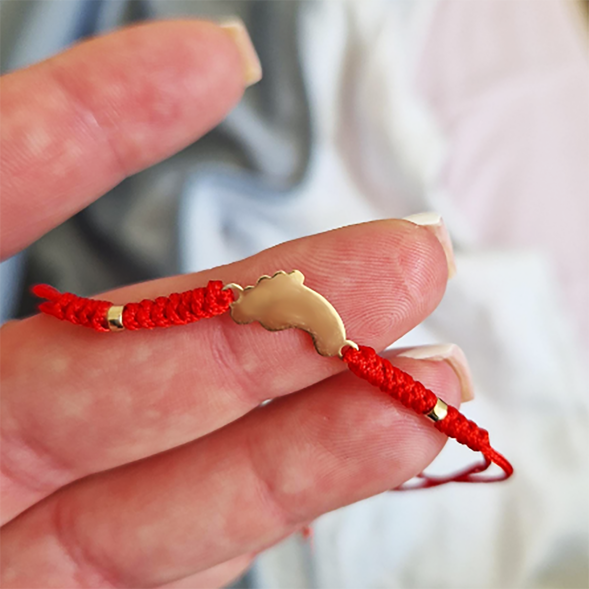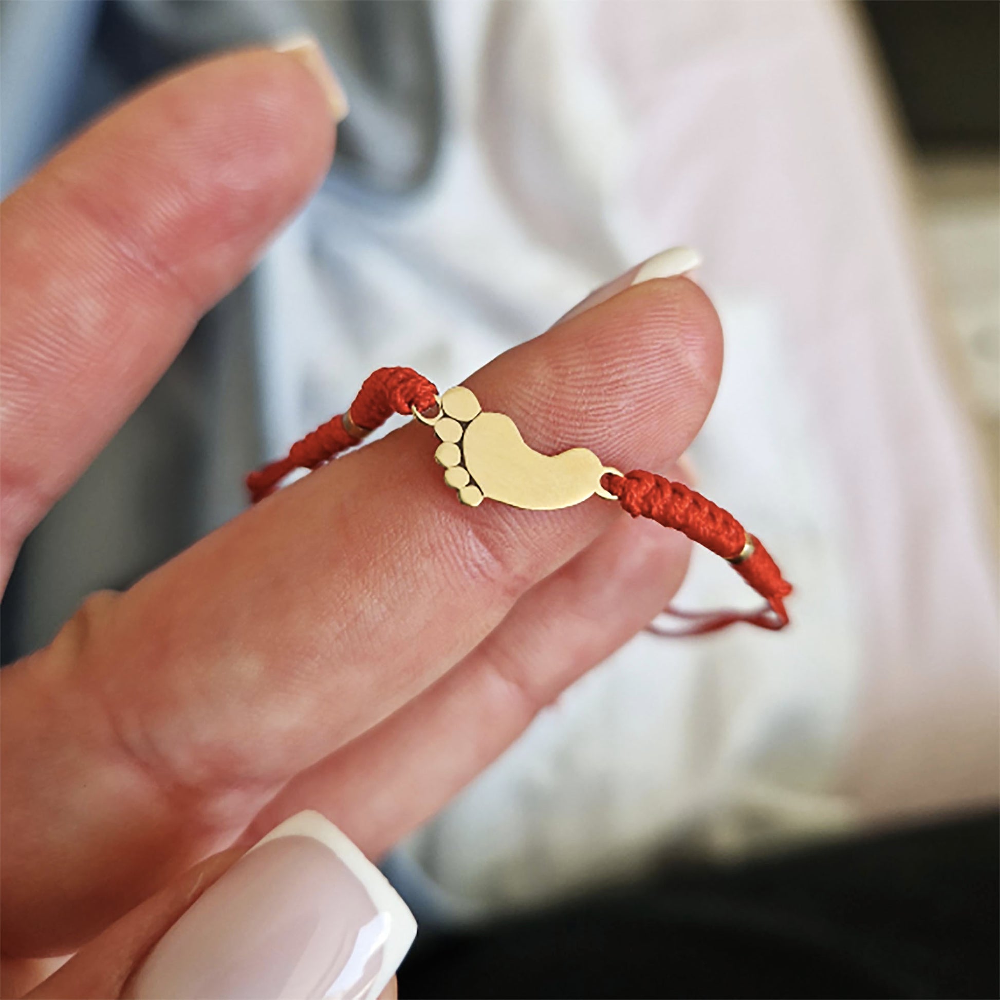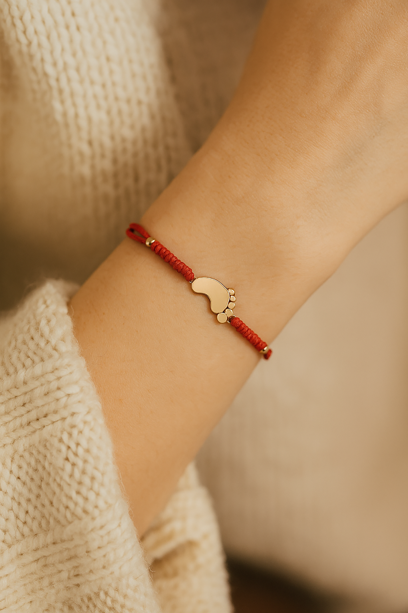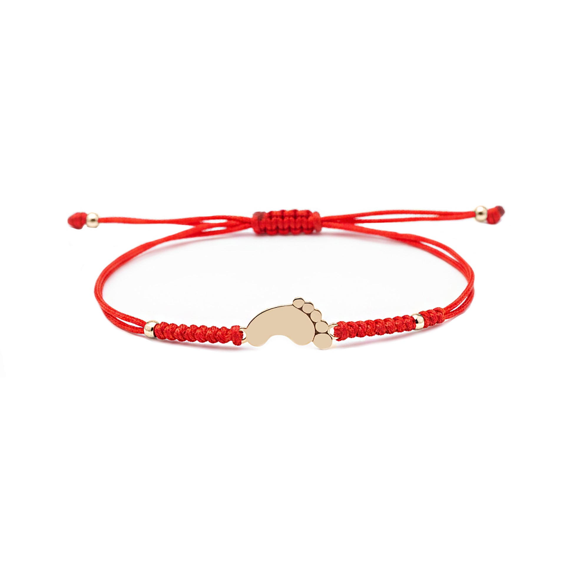 585 prabos auksinė raudono siūlo apyrankė su pėdute yra elegantiškas ir stilingas papuošalas, kuris gali būti puiki dovanos idėja arba papuošti jūsų pačios ranką.